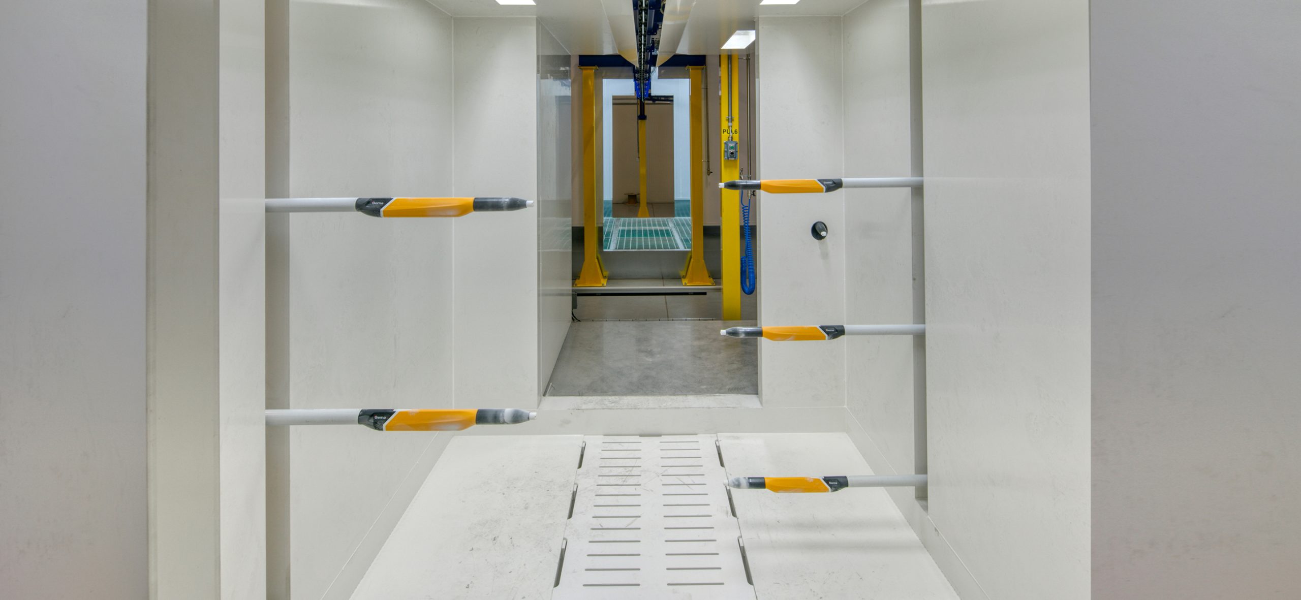 Ce type de cabine est généralement fourni avec un système de peinture automatique composé d’une série de pistolets automatiques de peinture à poudre. Ces derniers, grâce à l’utilisation de réciprocateurs dotés d’un système de détection automatique des pièces, peignent automatiquement, en ajustant leur course (en termes de distance de la pièce et d’amplitude du mouvement) en fonction des pièces détectées. Parallèlement à ce système, nous prévoyons toujours deux stations pour les retouches manuelles.
